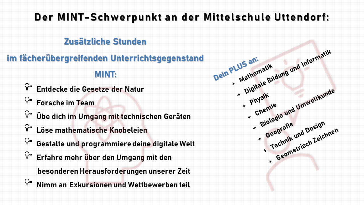 Ab dem Schuljahr 2023/24 gibt es an der Mittelschule Uttendorf eine MINT-Schwerpunktklasse.
